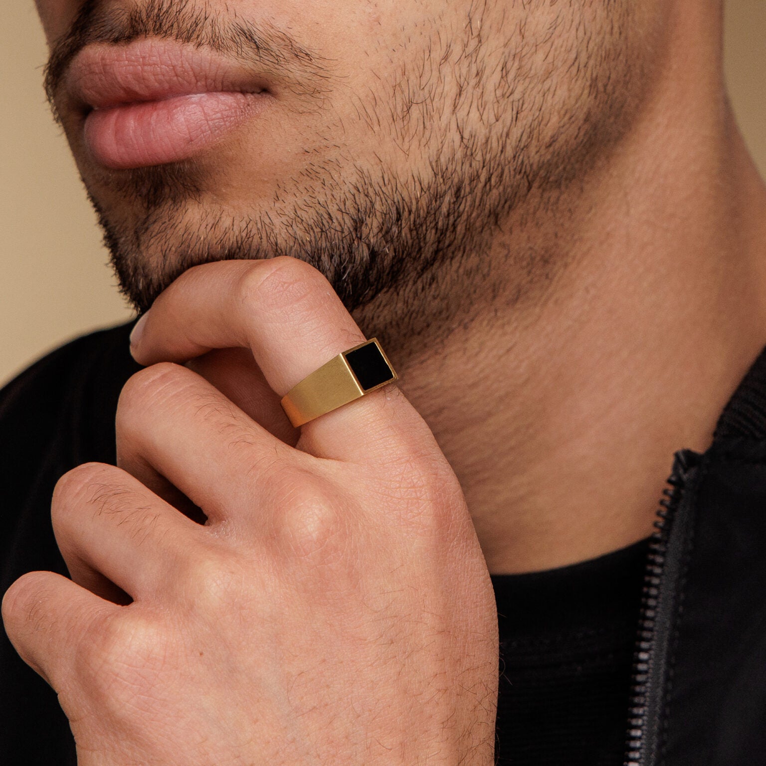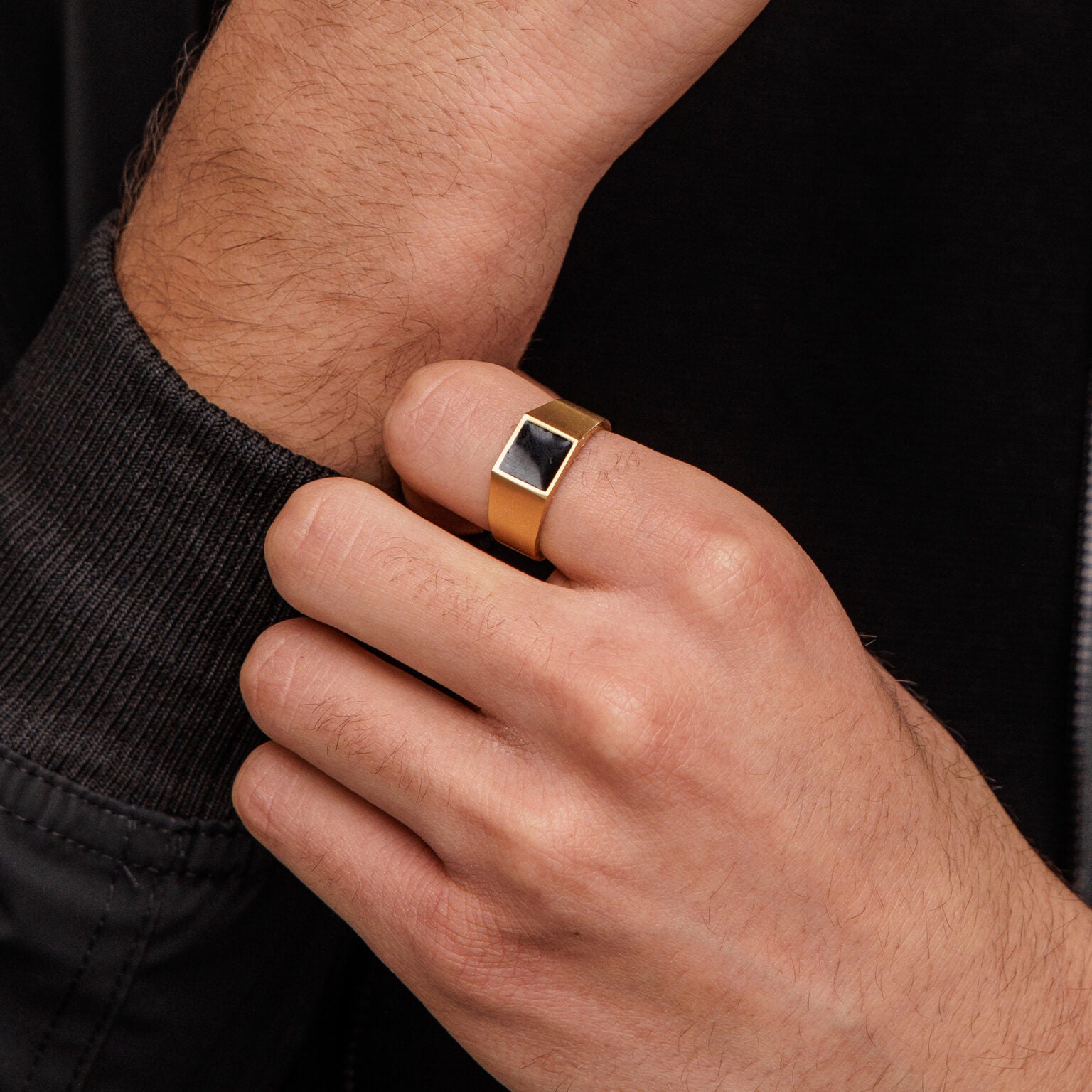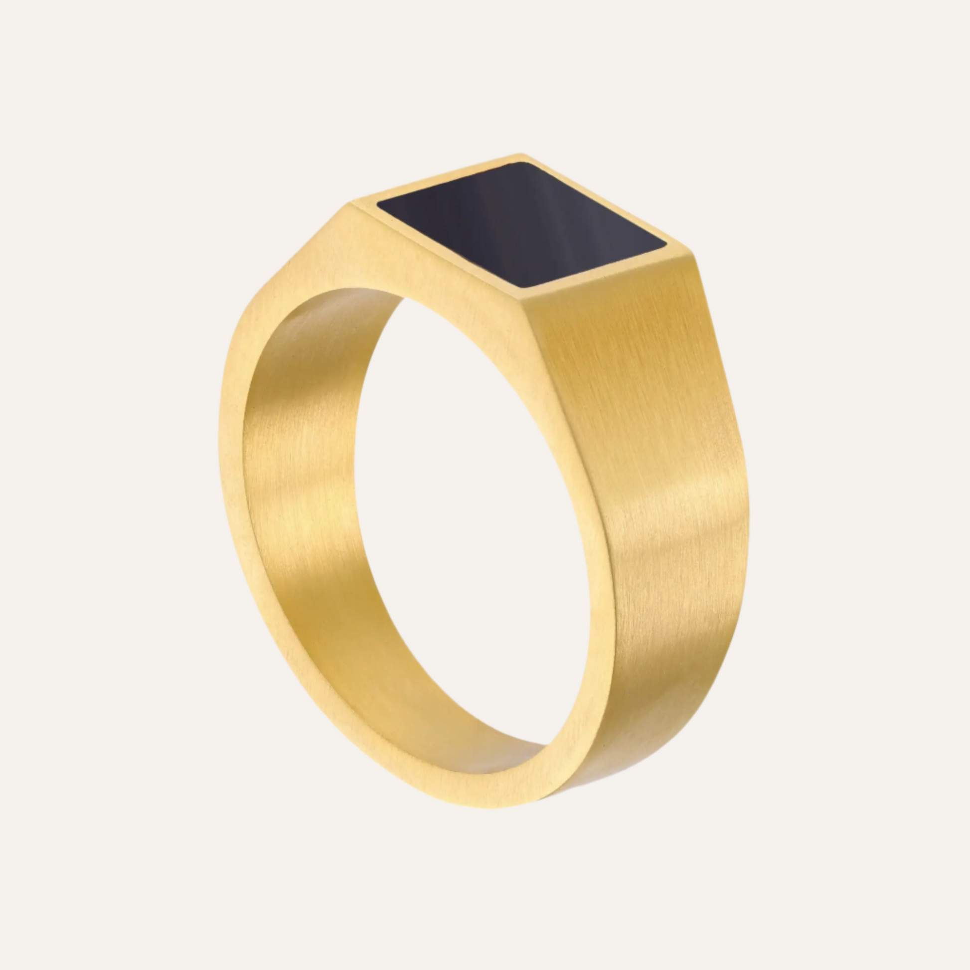 הטבעת מעוצבת בגימור חלק ומשובצת באבן שחורה מרובעת במרכז, המעניקה לה מראה יוקרתי, מסתורי ובעל נוכחות.