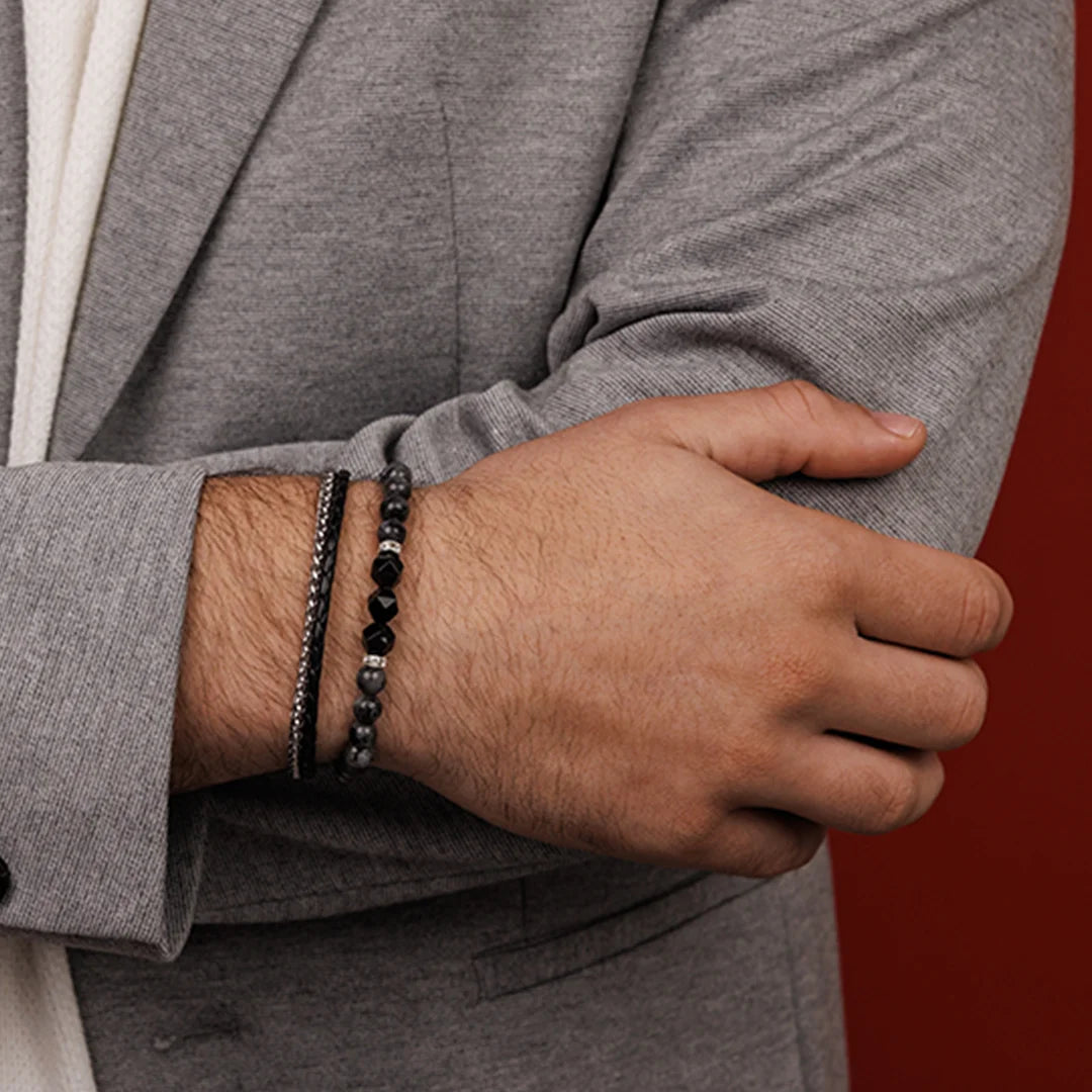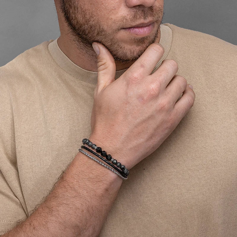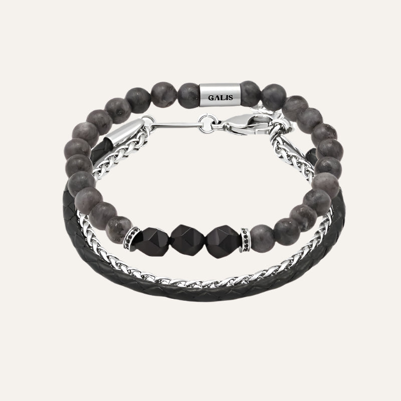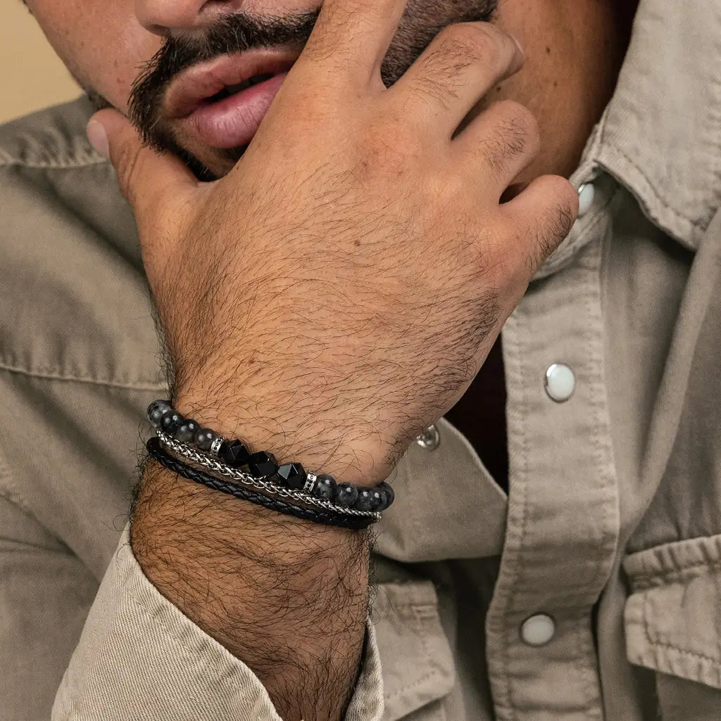 הצמיד השני משלב מתכת עם רצועת עור שחורה – שילוב מושלם של חומרי גלם שמבטאים סגנון גברי ועכשווי.