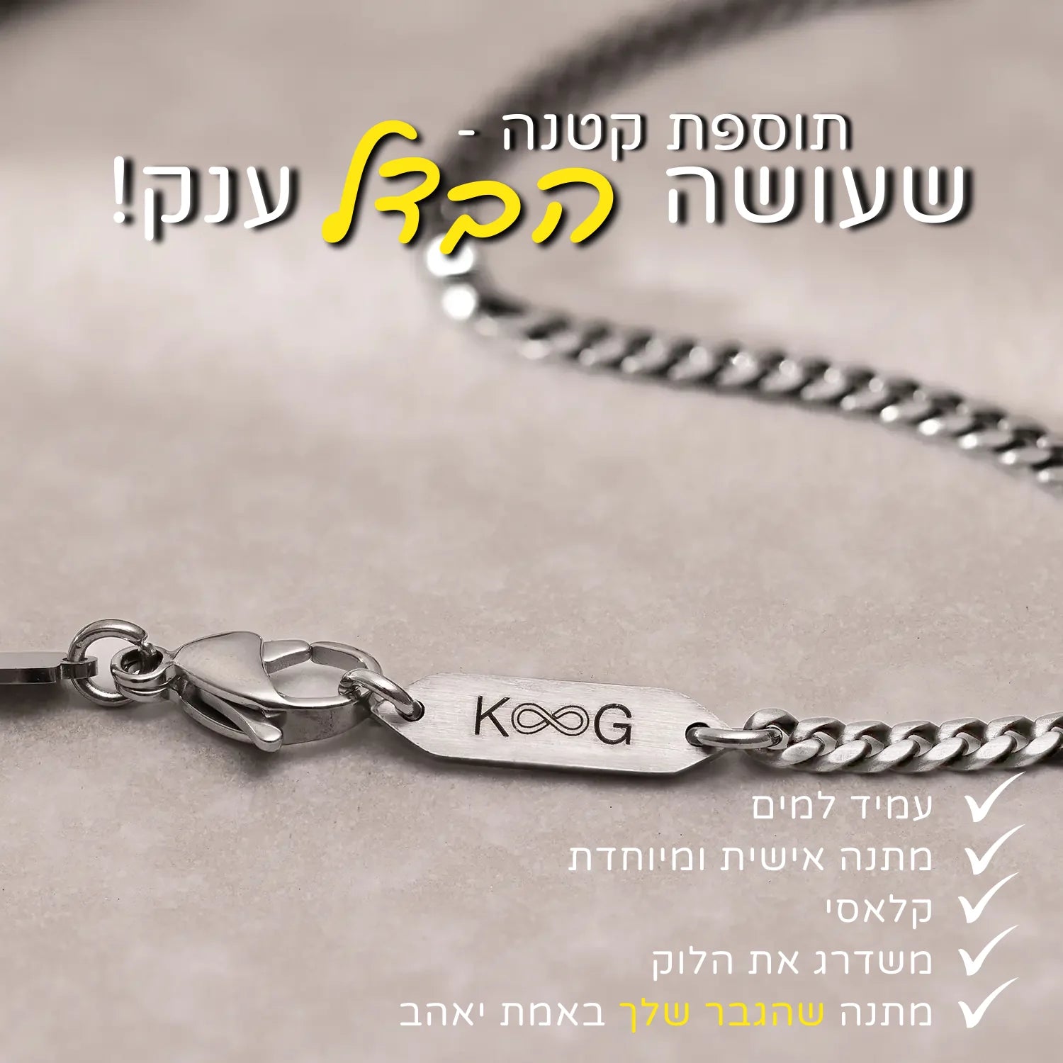 שרשרת גורמט בעובי 3 מ"מ, עשויה מפלדת אל-חלד עמידה ומבריקה, מקבלת טוויסט אישי עם תווית חריטה בהתאמה אישית.
